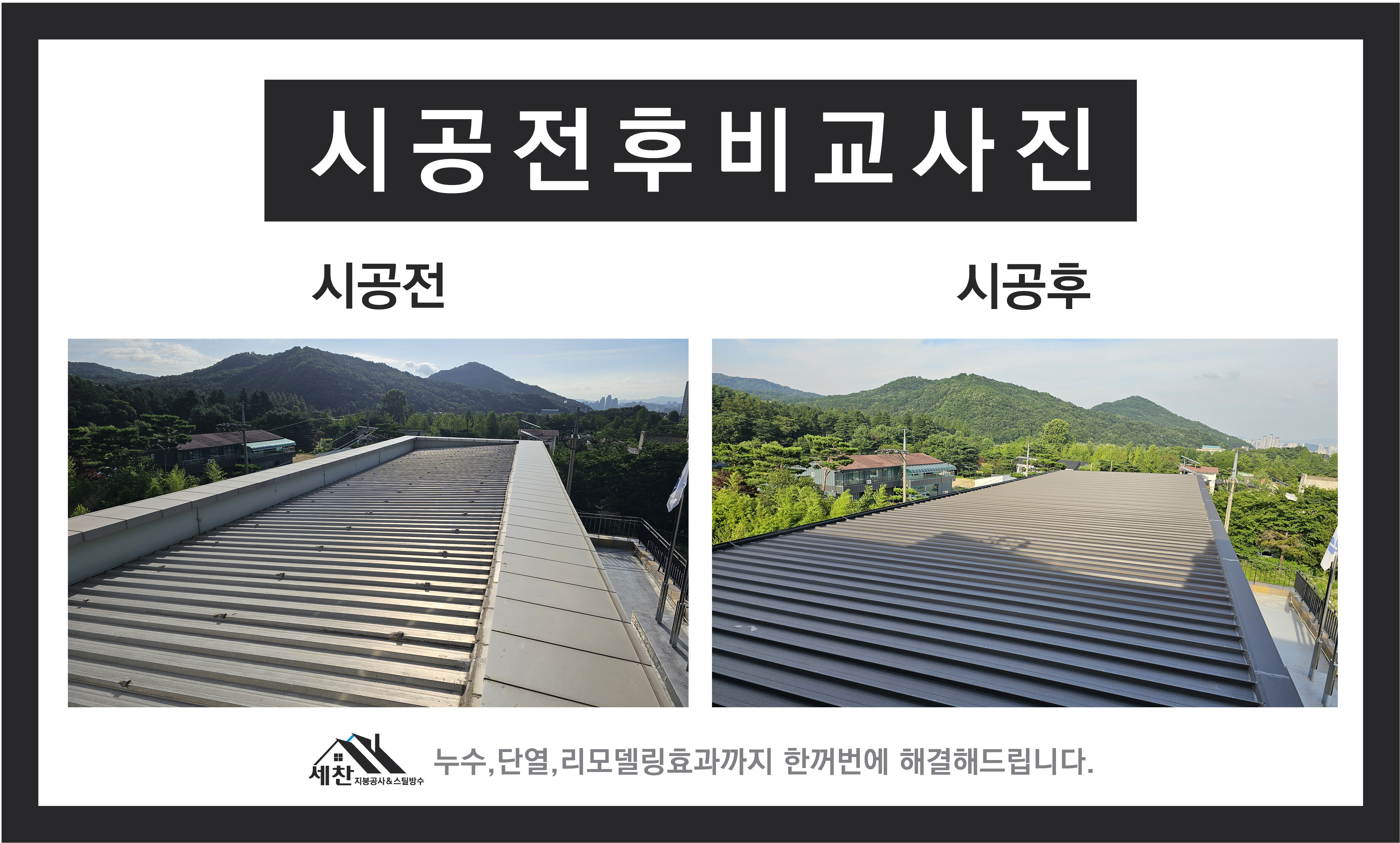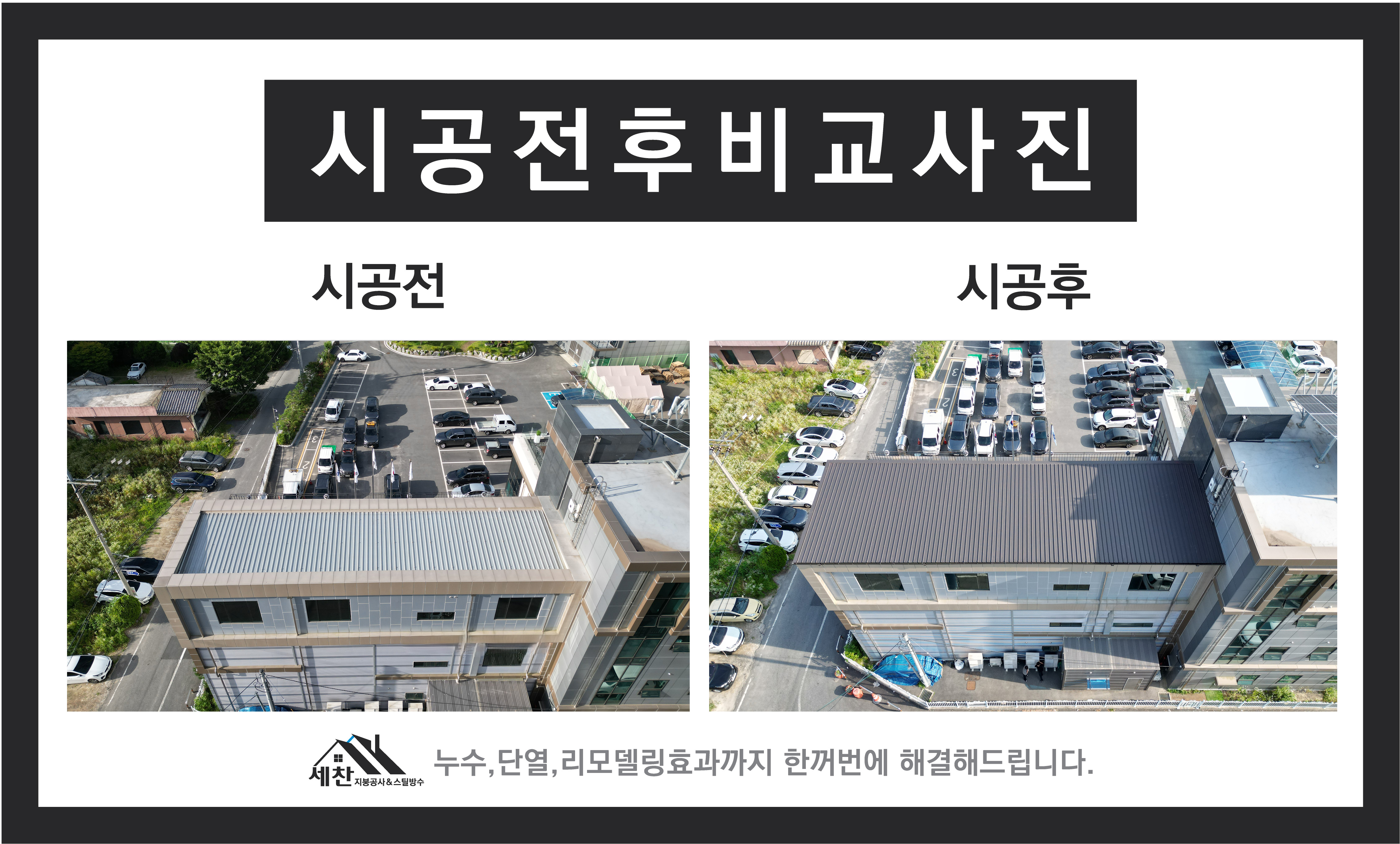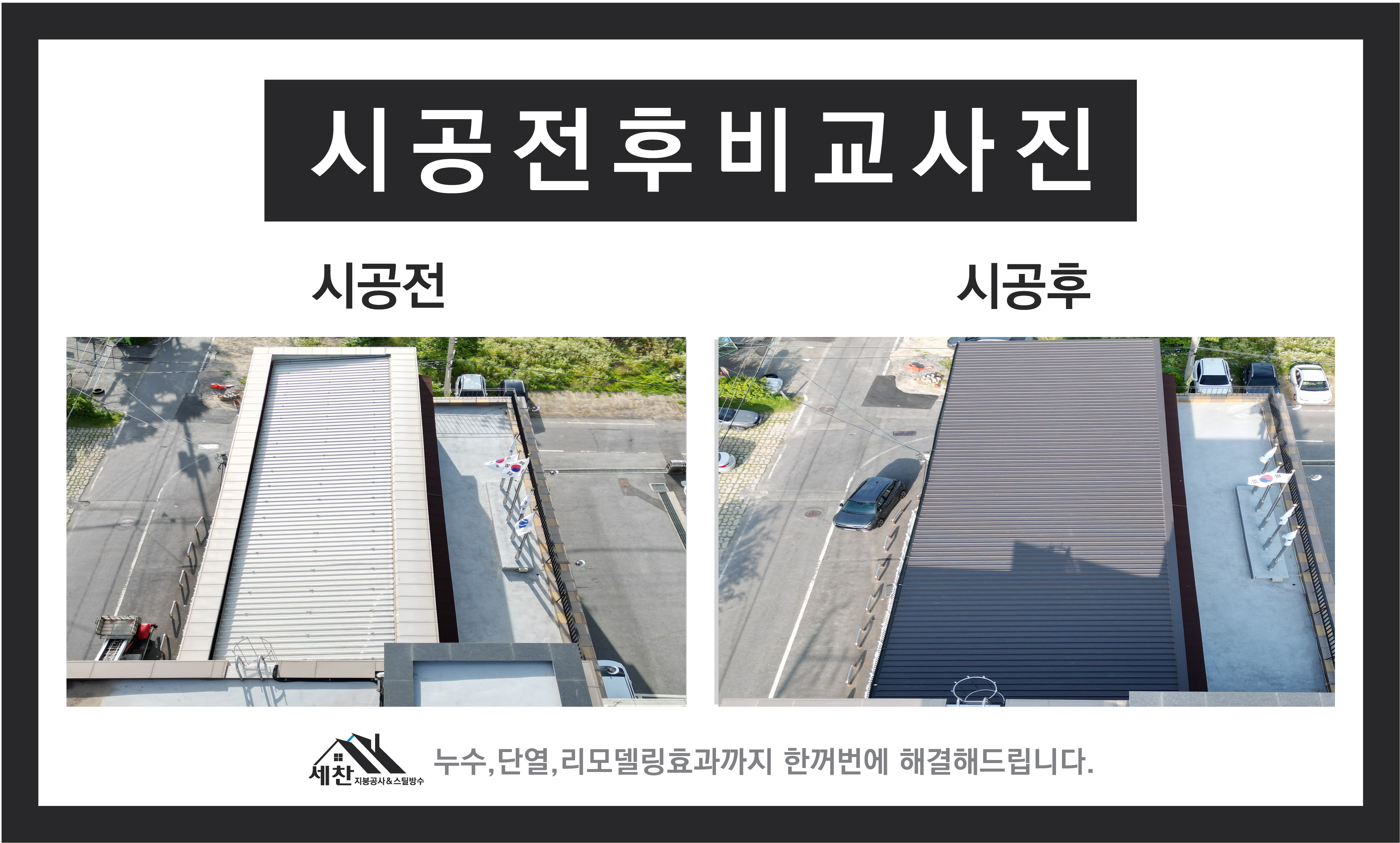 시공 후 변화된 모습은 고객님들께서 가장 크게 느끼실 수 있는 부분입니다. 칼라강판의 세련된 디자인과 내구성 덕분에 옥상의 미관이 크게 개선되었습니다. 시공 전에는 낡고 방수 기능이 떨어졌던 지붕이 이제는 깔끔하고 견고한 상태로 변하였고, 방수 효과가 뛰어나 비가 오거나 눈이 쌓여도 물이 새지 않는 안전한 환경이 되었습니다.