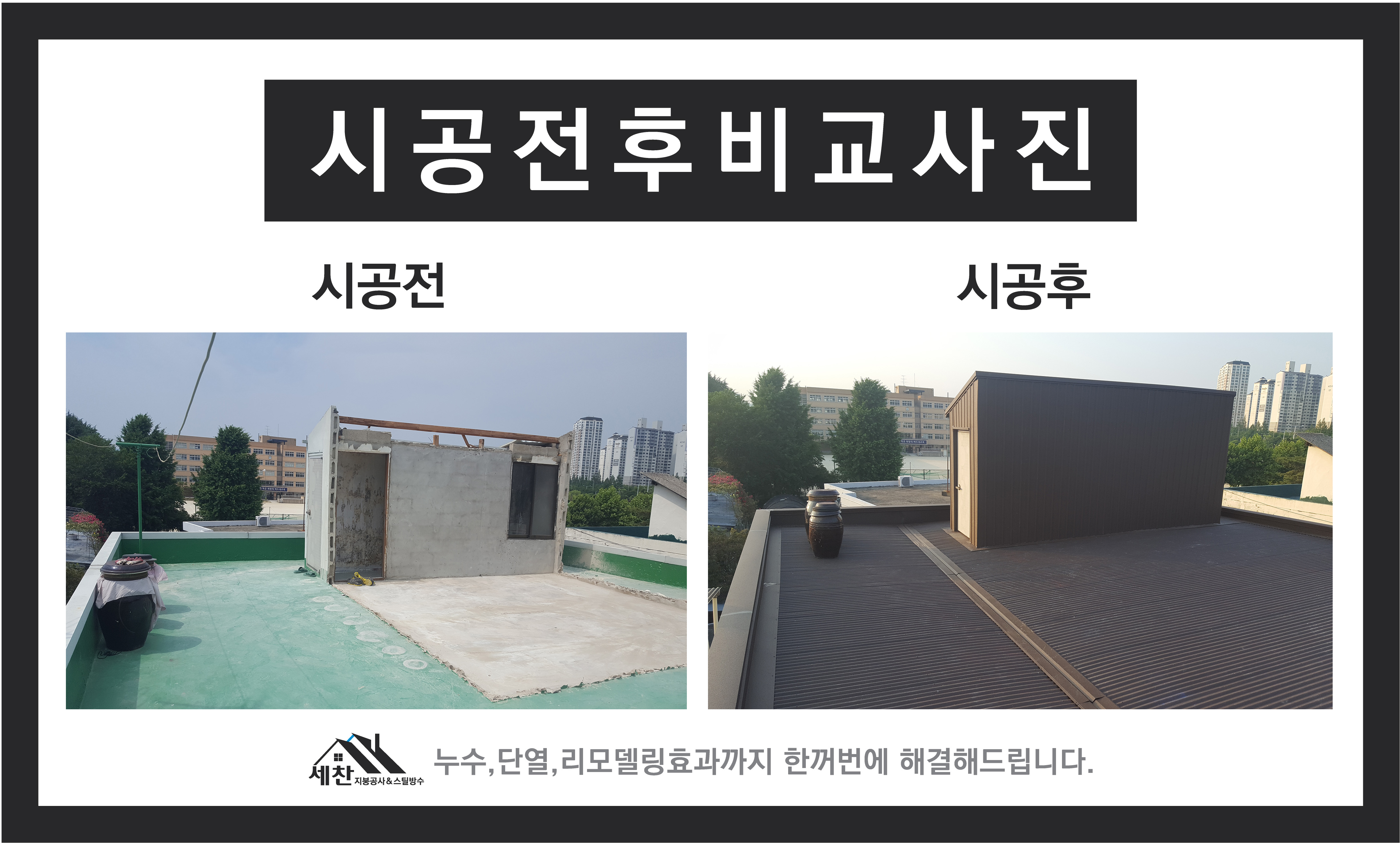 광주 옥상방수 시공현장의 전후를 비교해 보셨나요. 칼라강판으로 완벽하게 시공해서 내부에 누수걱정이 전혀 없도록 시공하였습니다.